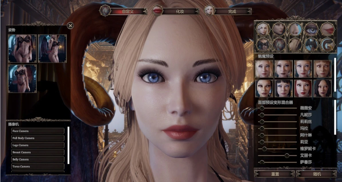 详细的角色创建包括几十个面部滑块,如眼睛大小、鼻子深度、嘴巴大小、下巴大小等,以及身体的许多选项,如胸部大小、腰围、臀围、肌肉线条、肤质,肤色等等!高清皮肤渲染可以让你看到她身体最精致的细节。最后,化妆品的选择,如唇膏,眼线,眼影,腮红,眉形,指甲的颜色。所有这些都可以帮助你创造你梦想中的魅魔!