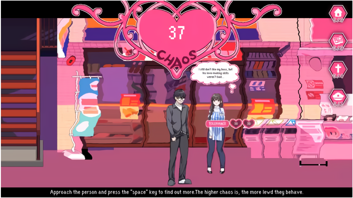 随着混沌值的上升,NPC将开始展现更多异常行为,可以解锁新的色情事件,台词与服装也可能产生改变。
