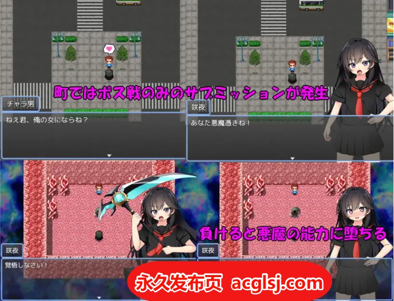 支线故事是和街上的男性搭话后会立即进入 Boss 战,失败的话会触发坏结局色情的短故事。