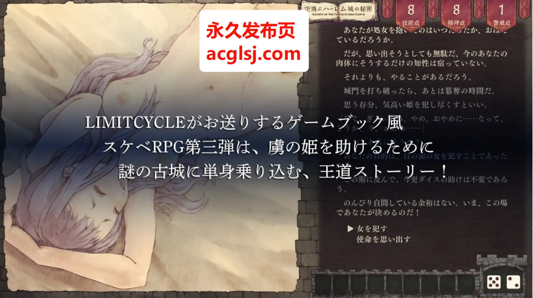 这是由LIMITCYCLE带来的游戏书风格色色RPG第三弹,讲述了一位营救被俘公主的主角,单枪匹马闯入神秘古城的王道故事。
