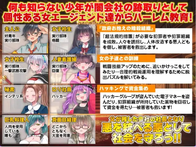 玩家扮演意外继承秘密事务所的年轻社长,需要在性格各异的女特工辅佐下,学习情报、谈判与资源管理,